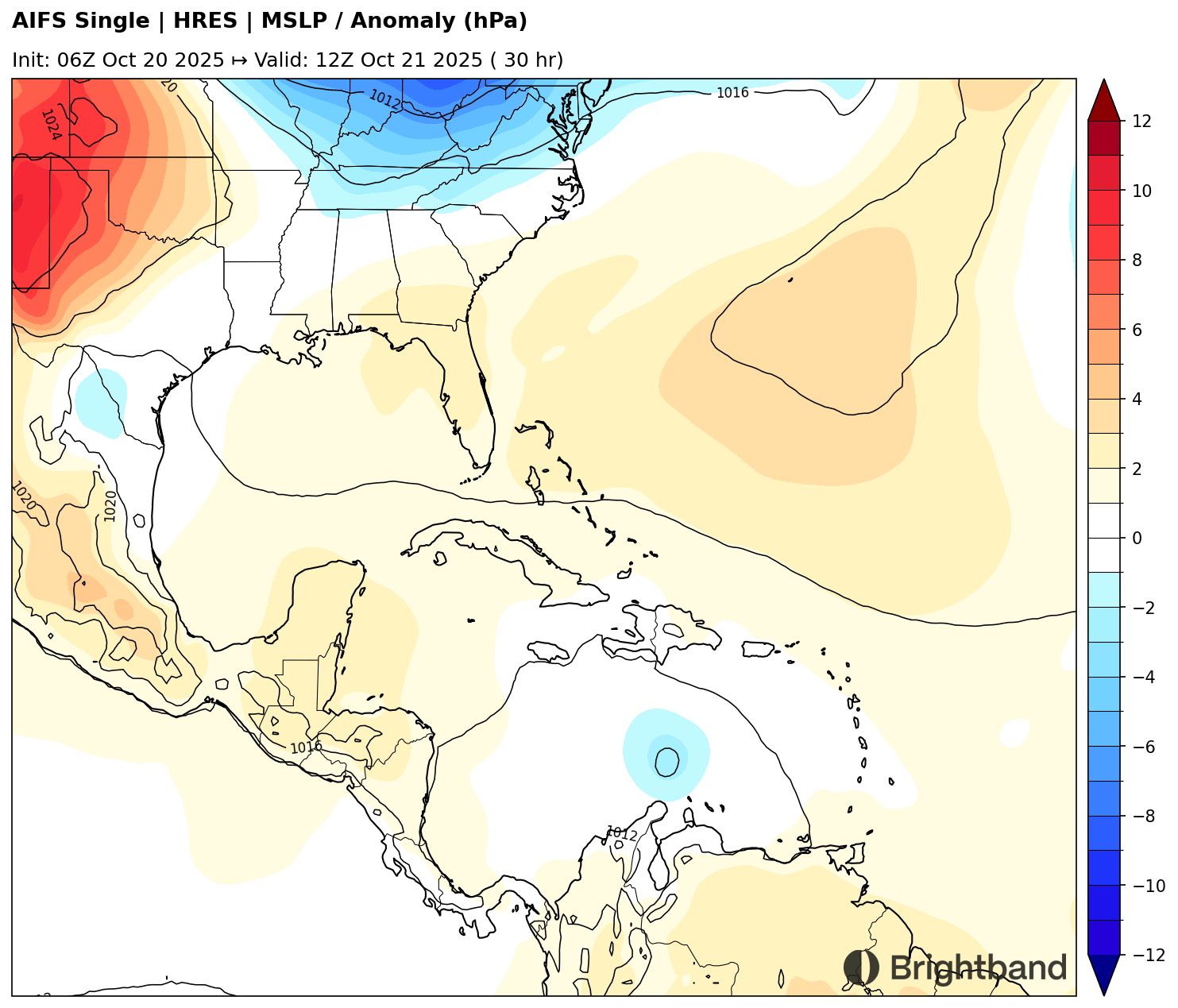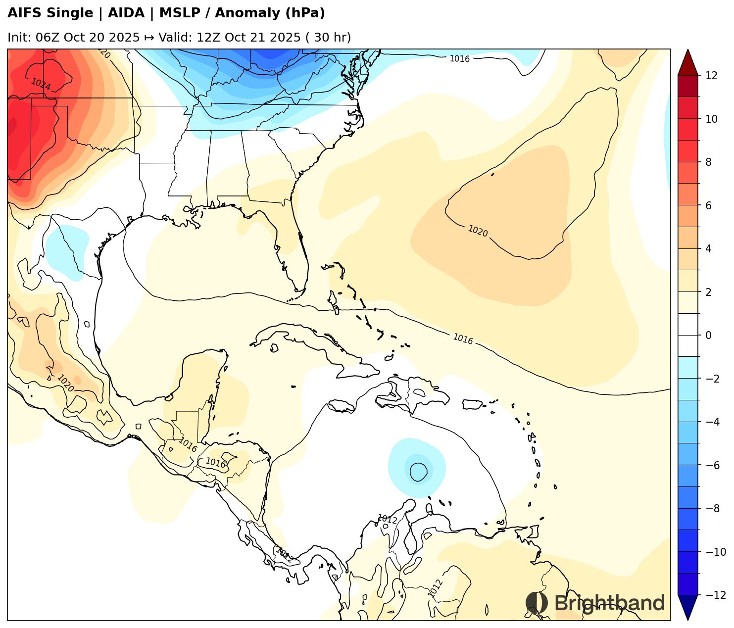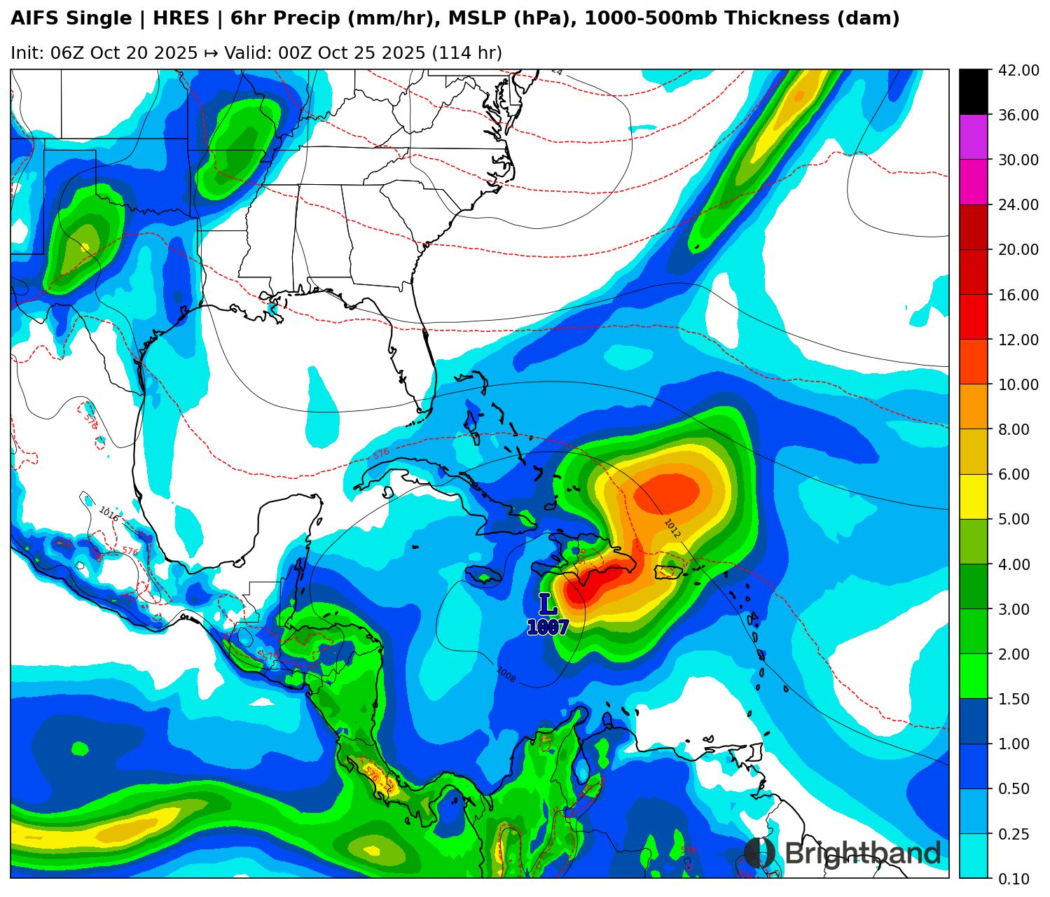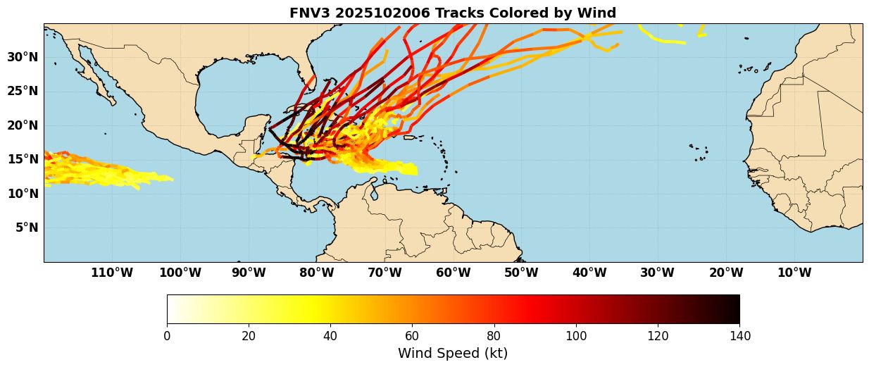 Individual AI models continue to show widely different solutions. For example, AIFS (Figure 2) follows the cluster towards Hispaniola and makes landfall near Haiti.
