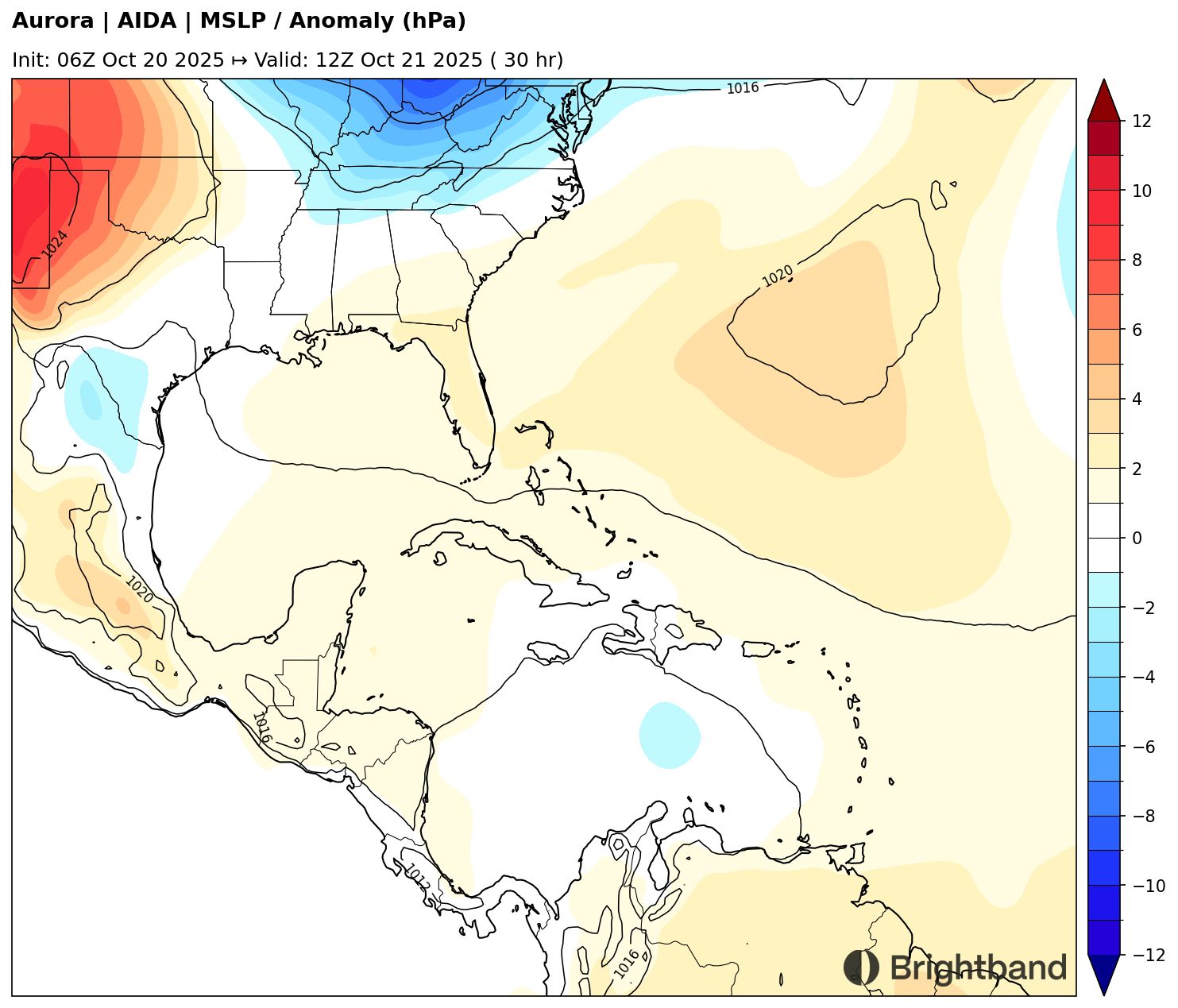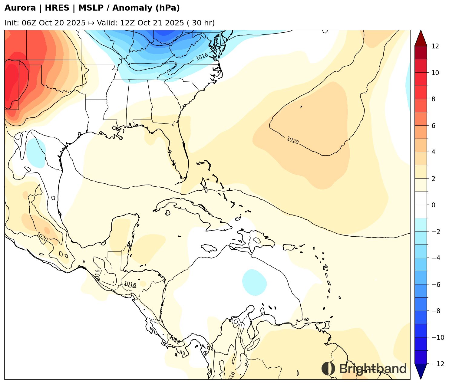 The differences in steering between these two models does not seem notably different in the short term. What seems important is the early intensity. For example, at 30h AIFS (Figure 4) has a stronger initial vortex than Aurora (Figure 5). This seems to be just enough for the system to feel the weakness in the subtropical ridge and move to the north. If the system is weaker initially, it may not feel this weakness and just continue west.