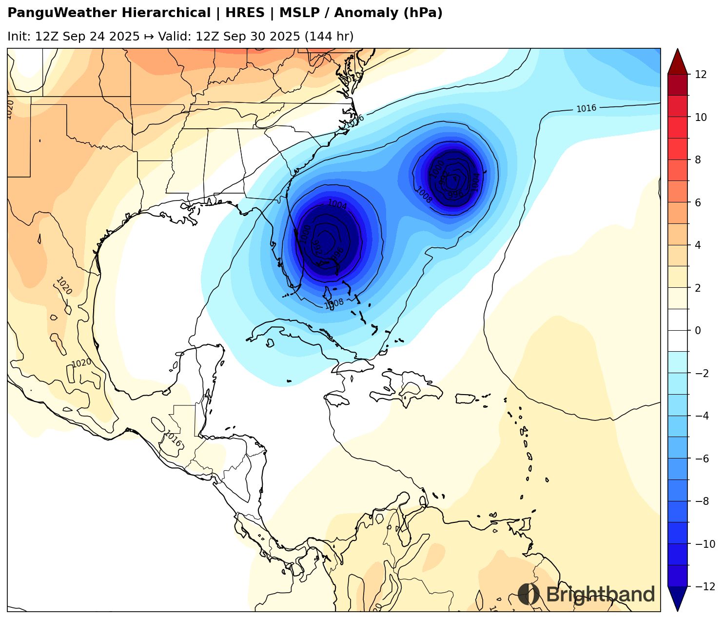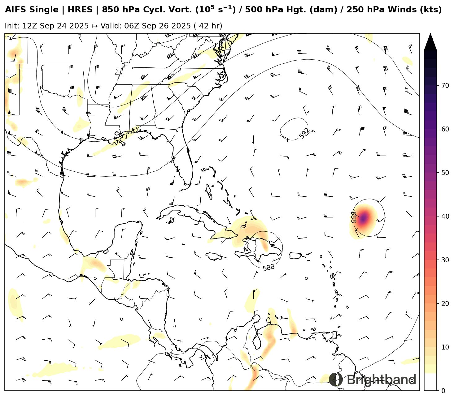 The vorticity of 94L is forecast to move across the mountainous terrain of Hispaniola (Figure 1). This can disrupt circulations and form new ones. It’s not clear how well AI-based models will handle this evolution, so that will be interesting to track.