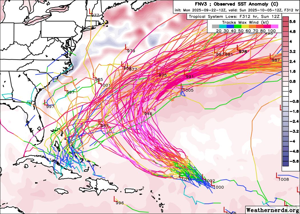 The leading wave has been a little more inconsistent in model signal, although Deepmind has been fairly aggressive in developing it. Earlier runs of AIFS were showing it potentially developing in the Northwest Caribbean, but recent runs seem to favor a track towards the Bahamas, where it may start to spin up. After this, it seems likely to get picked up and pulled north by a cutoff trough over the SE (Figure 6). The exact location of this trough relative to the storm and the US coast will likely determine how much of a threat this is to make landfall. The Carolinas and New England should definitely keep an eye out. There’s a lot of moving parts and a fairly complicated steering pattern. We’ll see how it evolves through the week.