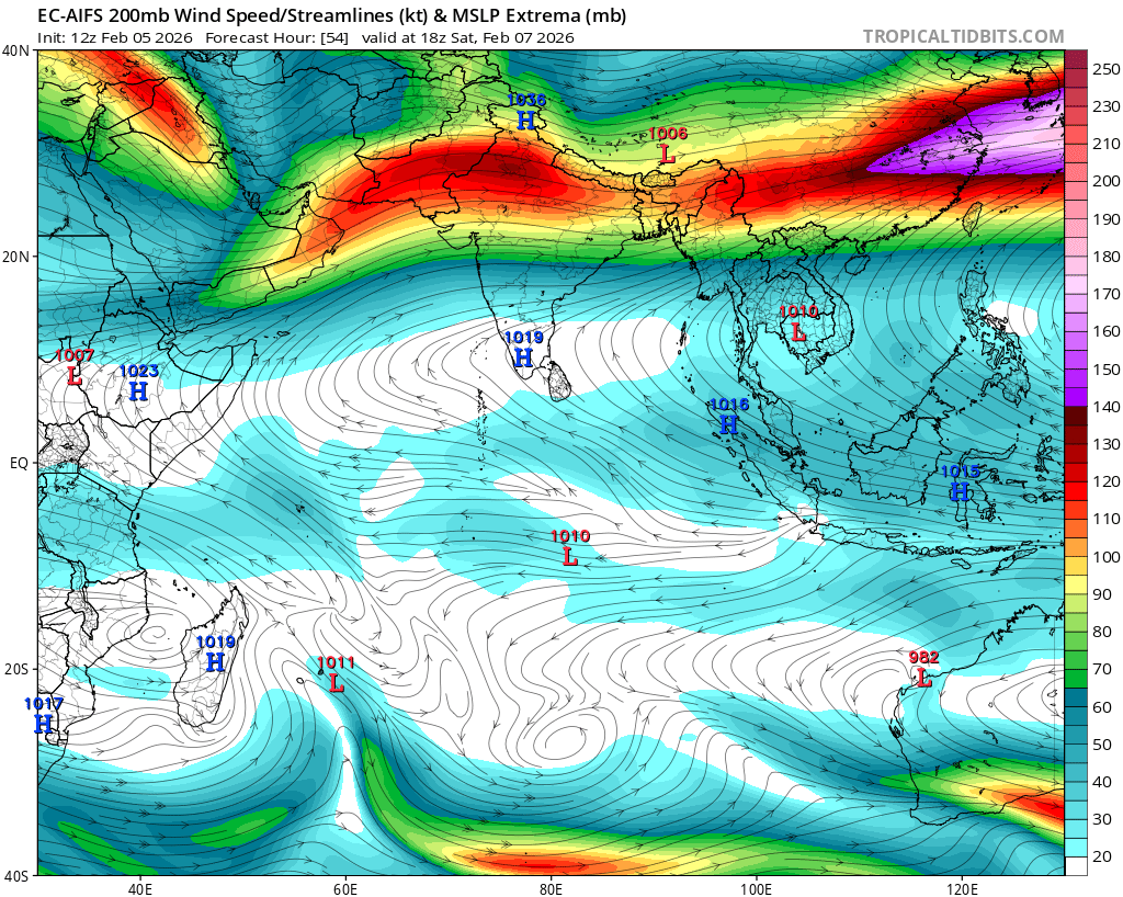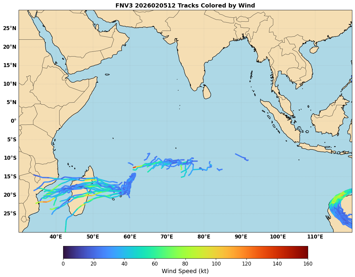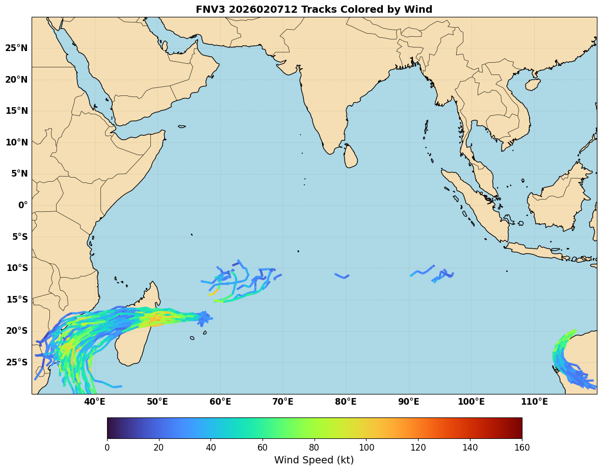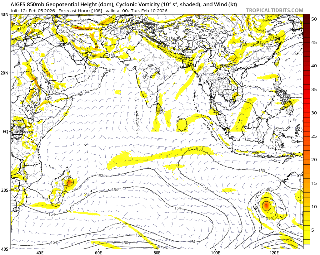 One question is how Google DeepMind’s ensemble, which has become one of the leading models for TC forecasting in the Atlantic and East Pacific, performed for this system. Figure 3 shows the DeepMind forecasts from 12 UTC February 5, out to 7 days. A cluster of members showed the system dissipating, like EC-AIFS for this cycle. Another cluster of members kept the system alive and moved it towards Madagascar, though they were almost all too weak.