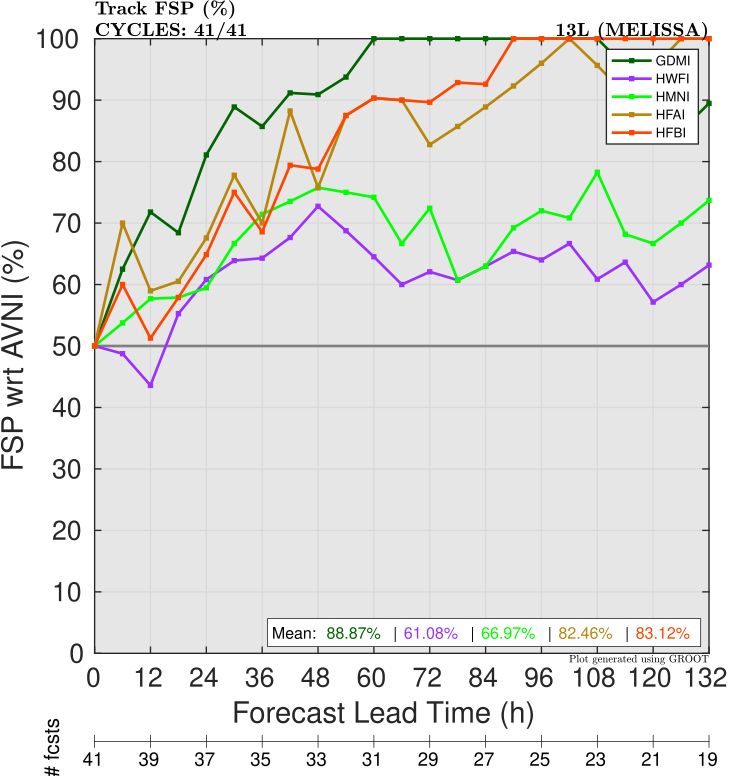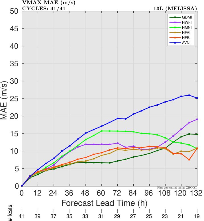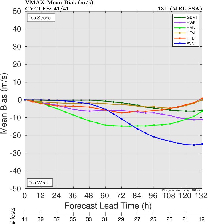 Looking at the intensity bias (Figure 5), we see that all models had a negative bias, which makes sense as most models struggled to fully resolve the extreme intensity that Melissa achieved. However, DeepMind had the lowest negative bias at Days 2-3, similar to the operational HAFS-A. HAFS-A and HAFS-B were slightly better at Day 5.