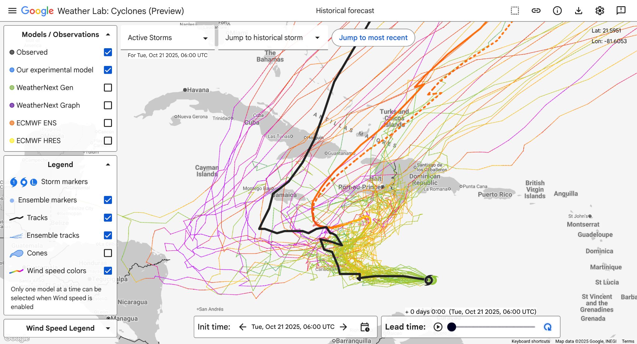 One thing to note is that the version of DeepMind that is included in the NHC “adecks” is the ensemble mean. Google has made the full ensemble available as well, both on their website and for public downloads. Using an ensemble mean produces both strengths and weaknesses. Often, an ensemble mean has lower errors overall than a single deterministic forecasts, as biases average out. This is why NHC often leans on consensus forecasts in their official forecasts. An ensemble mean is sometimes an average between widely disparate outcomes, which can help minimize errors, but also mask some of the overall uncertainty in the forecast. An example comes from the October 21, 06 UTC DeepMind ensemble forecast (Figure 7). The mean track was not bad, but many members were too far right, showing a track towards Hispaniola (similar to GFS), while others were also too far west near Honduras. The mean track was simply an average of two incorrect outcomes with opposite biases. Is it an apples-to-apples comparison to compare this with deterministic models like HAFS? Not necessarily, though the ability to run skillful ensembles quickly is one of the big draws of AI forecasts.