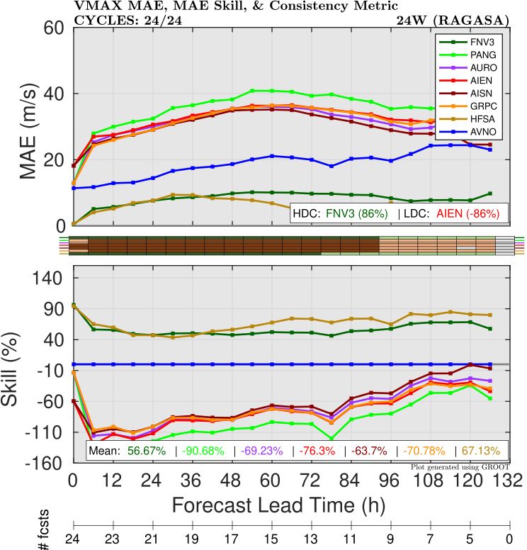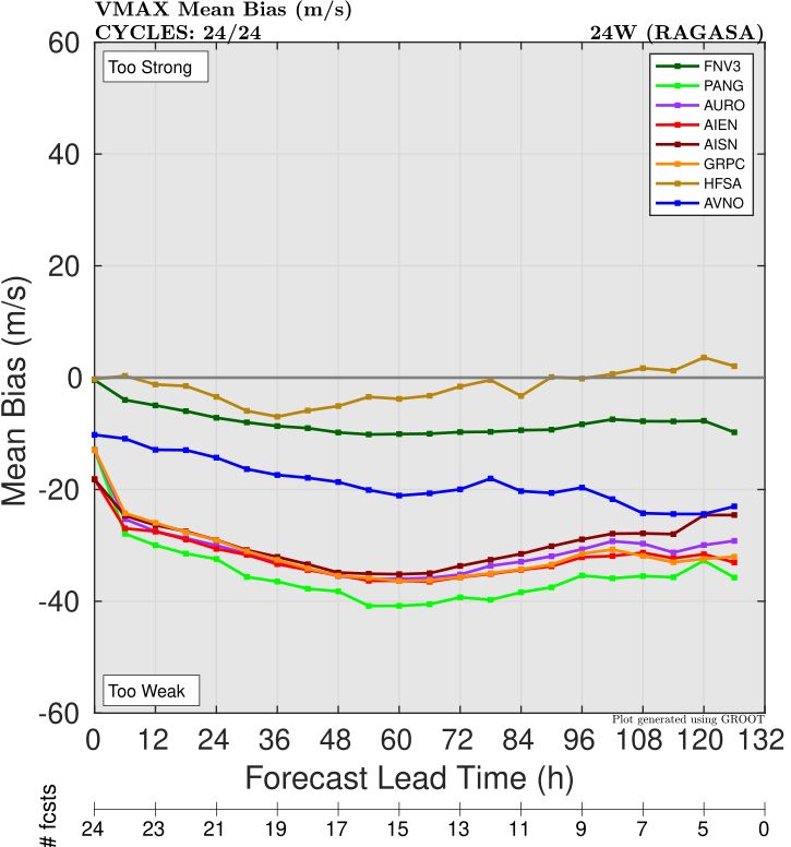 In most validations of AI models for TCs so far, the intensity performance has lagged significantly behind the track skill, largely due to the low resolution of the output. In general, that was the case for Ragasa for intensity error/skill (Figure 2), with models showing a weak/negative bias (Figure 3). The one notable exception was Google Deepmind (FNV3), which significantly outperformed the GFS at all lead times and was actually comparable to HAFS-A for the first 36 hours.