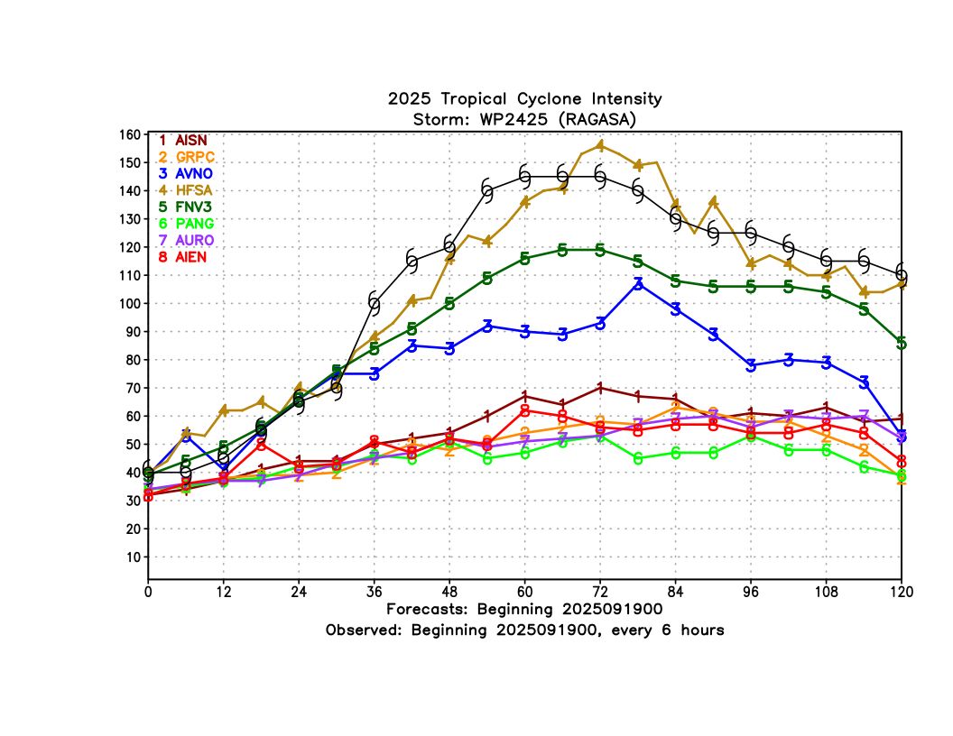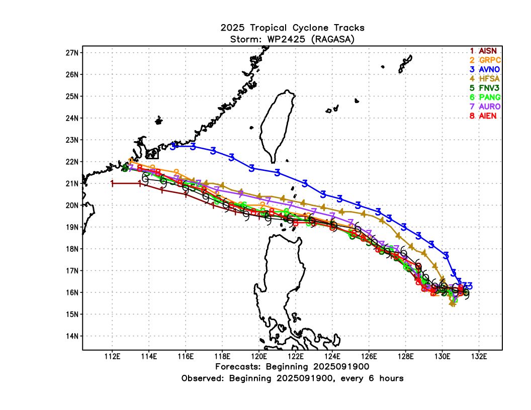 An example of some of these track forecasts is shown from September 19, 00 UTC (Figure 2). For this cycle, the GFS (AVNO) was too far north, showing Ragasa passing close to the southern tip of Taiwan. However, most of the AI-based models were far more accurate, correctly showing it passing between Luzon and Taiwan and near Babuyan Island.