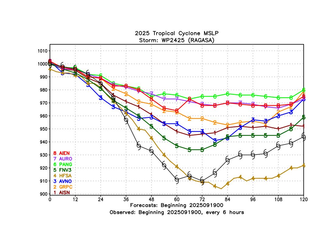 Looking at the same early forecast as shown previously (September 19, 00 UTC), we see that this intensity forecast evolution generally matched what we see in the averages, for both maximum wind speed (Figure 5) and minimum central pressure (Figure 6). HAFS-A, with its 2-km storm-following moving nest, was the only model to accurately depict the rapid intensification. However, FNV3 was not too far behind, with the ensemble mean showing Ragasa reaching a peak intensity of 120 knots.