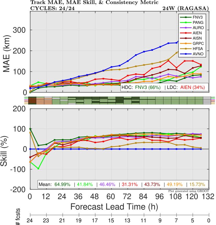 For Typhoon Ragasa, AI models showed excellent track forecast performance, consistent with recent results from a variety of basins and models. In general, the intensity skill was lower than dynamical models, but FNV3 (Google’s Deepmind) demonstrated skill that was competitive with dynamical model forecasts, indicating that with continued development and progress, AI models can become a useful part of the TC intensity forecast process as well.
