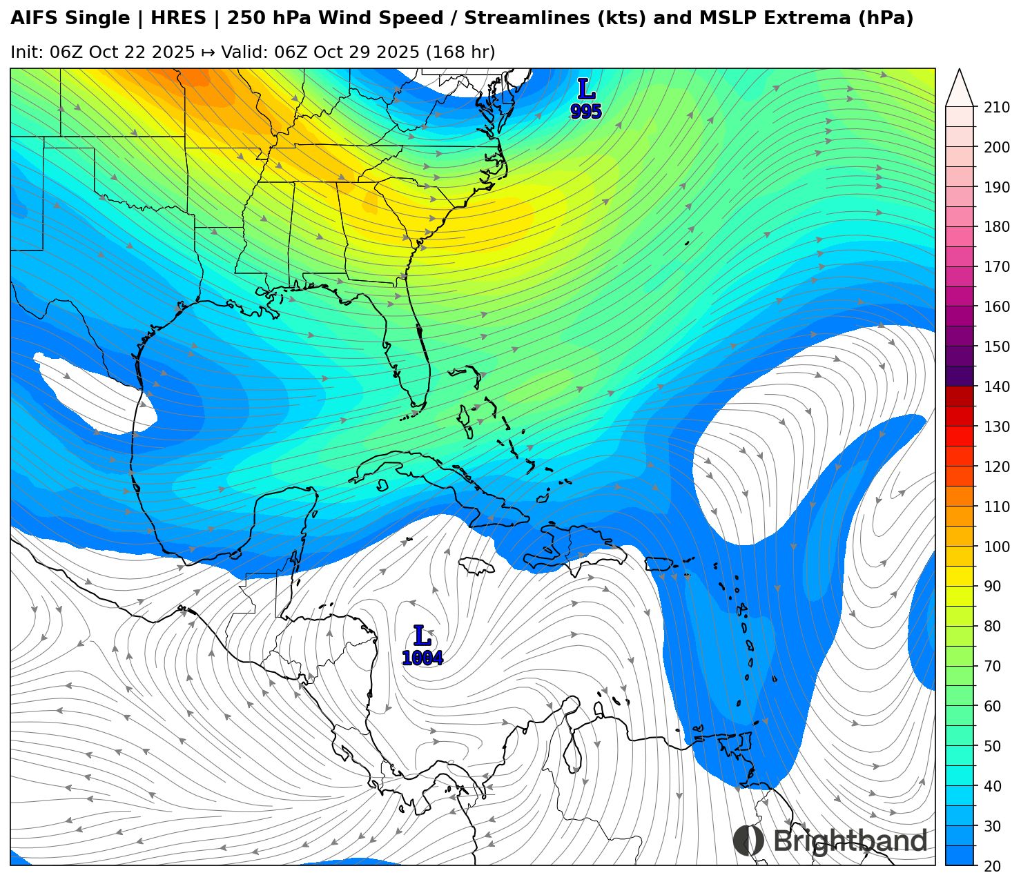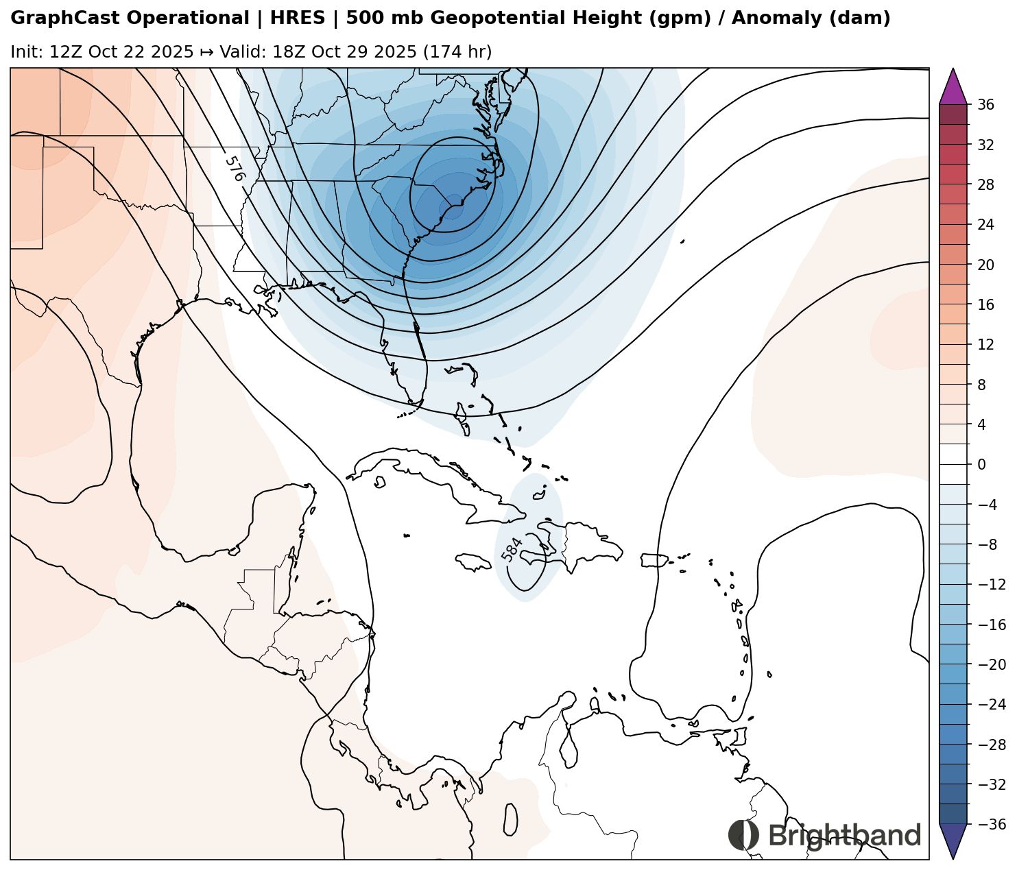 The track forecast has started to narrow a little bit. Fewer models now take the storm towards Hispaniola, and more of them show a westward track south of Jamaica and towards the NW Caribbean. There are still some discrepancies, however, with some models showing a stall near Jamaica and turning towards the NE. This seems to be due to differences in a trough over the East Coast of the US in about 6-7 days. For example, GraphCast shows Melissa getting pulled NE across the Windward Passage and tip of Haiti ahead of this trough (Figure 4).