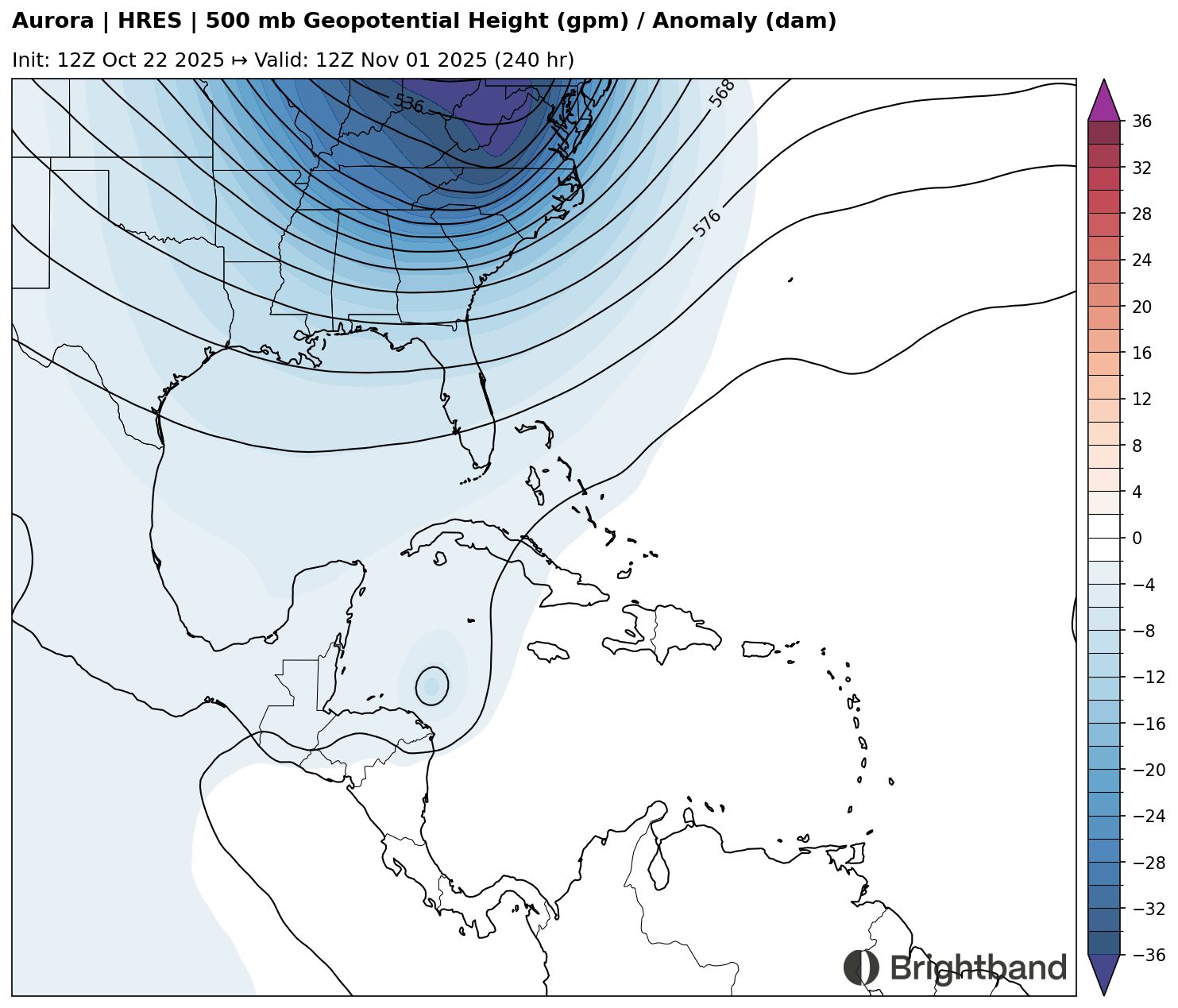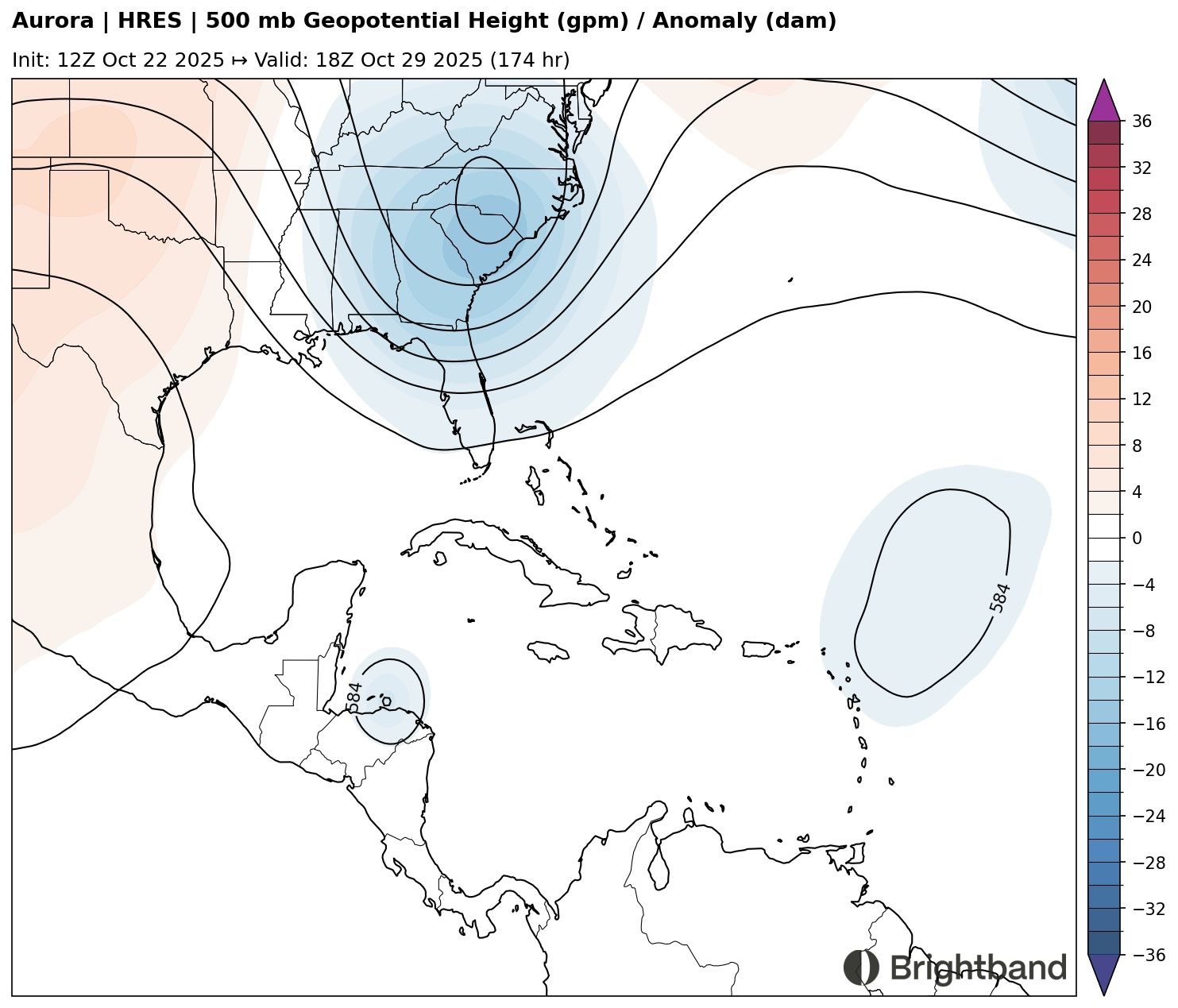 In contrast, Aurora has the storm further west initially, and a weaker trough (Figure 5), so the storm misses the immediate NE turn and continues NW for a while.