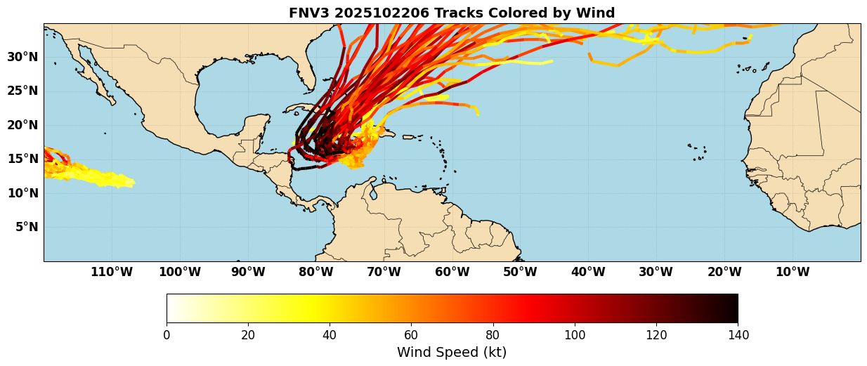 Tropical Storm Melissa formed in the Caribbean yesterday. Currently the storm is moving very slowly north of South America. It should start to turn NW today, but there is still a lot of track uncertainty in the medium range. This is illustrated in the Google Deepmind/FNV3 ensemble (Figure 1), which still has a variety of tracks: some towards Hispaniola and some turning west near or South of Jamaica and spending more time over the Caribbean.