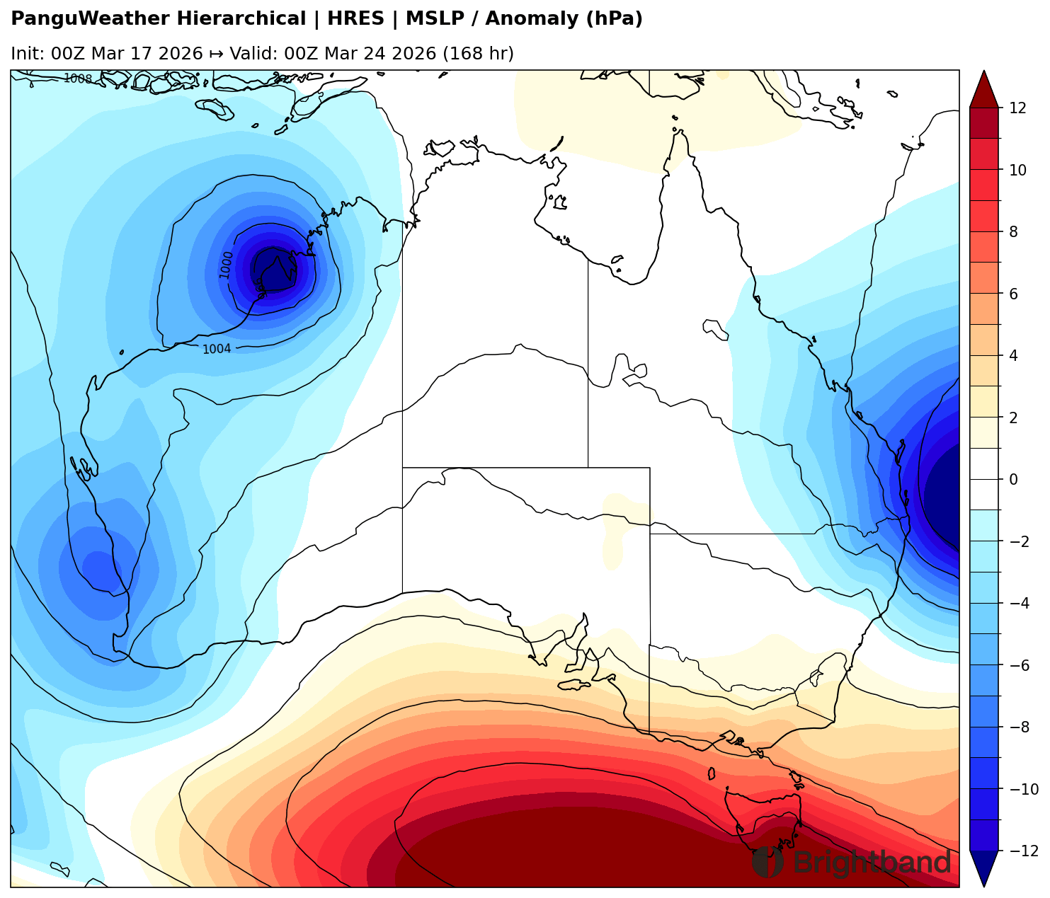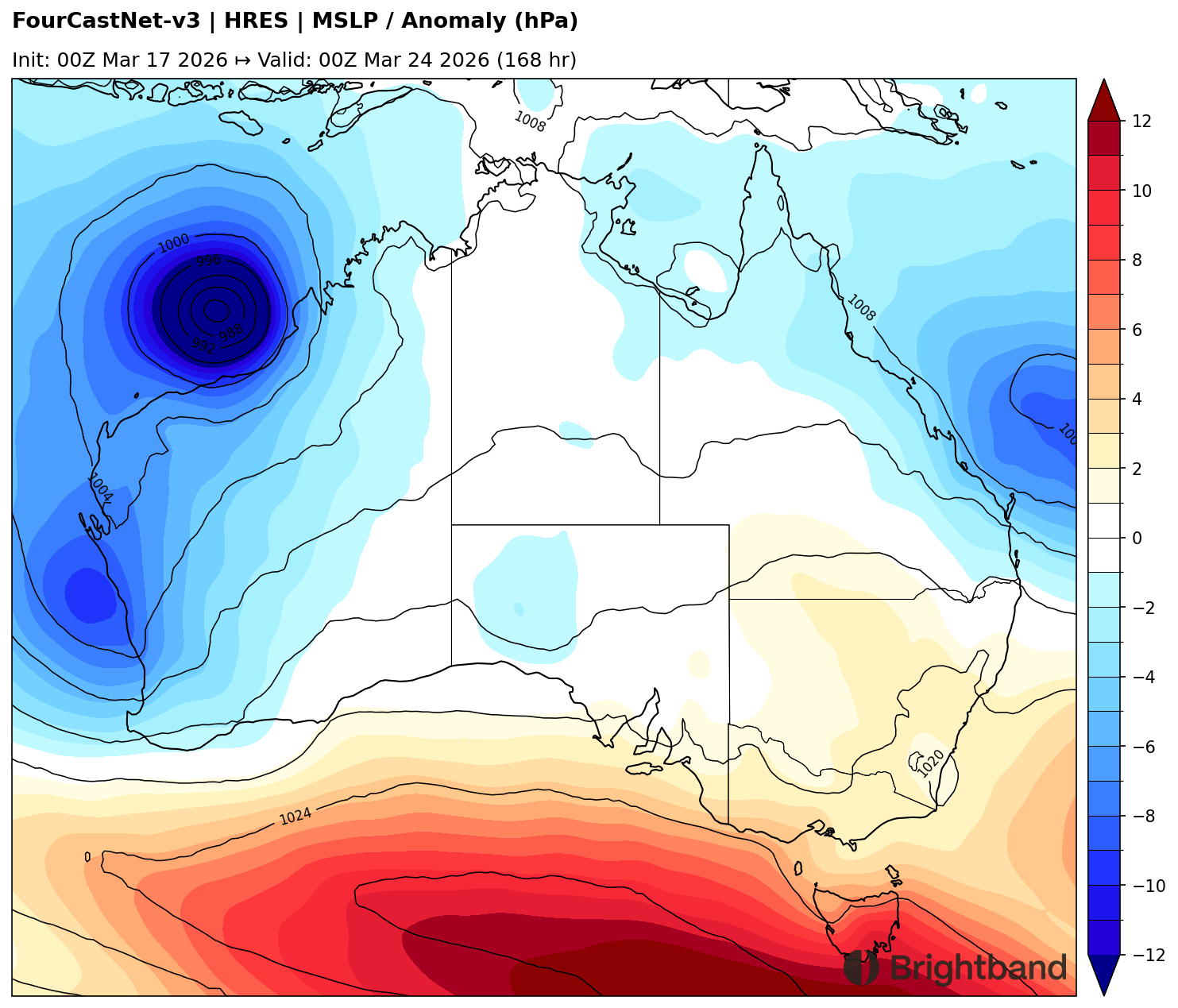 The long-term fate is somewhat uncertain because the track is likely to be generally parallel to the coast of Australia. Some models have Narelle emerging back over the water to the Northwest of Australia, with time to reintensify before potentially making yet another landfall in Western Australia (Figure 5). Other models have the TC hugging the coast (Figure 6) and never getting a chance to significantly reintensify a 3rd time. Right now, Google DeepMind favors a scenario where the TC stays offshore long enough to intensify. It will be interesting to monitor this trend over time. A stronger cyclone initially will likely move more poleward (to the south), which might keep it inland for longer.