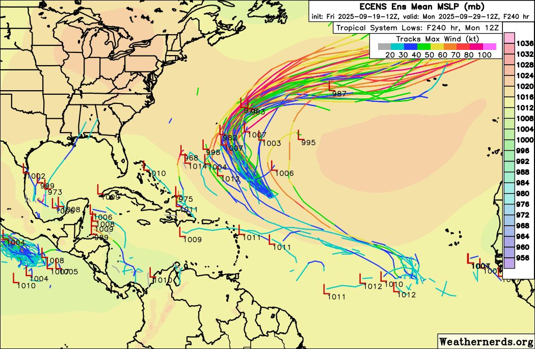 Behind Gabrielle, it’s not clear whether the Atlantic will slow down or continue to be active. There is some discrepancy between the AI models and physics-based models on this question. As Figure 1 shows, Deepmind is very active with two waves in the Central Atlantic developing into tropical cyclones further west, over the NW Caribbean or Southwest Atlantic. On the other hand, the ECMWF ensemble (Figure 2) is much quieter.
