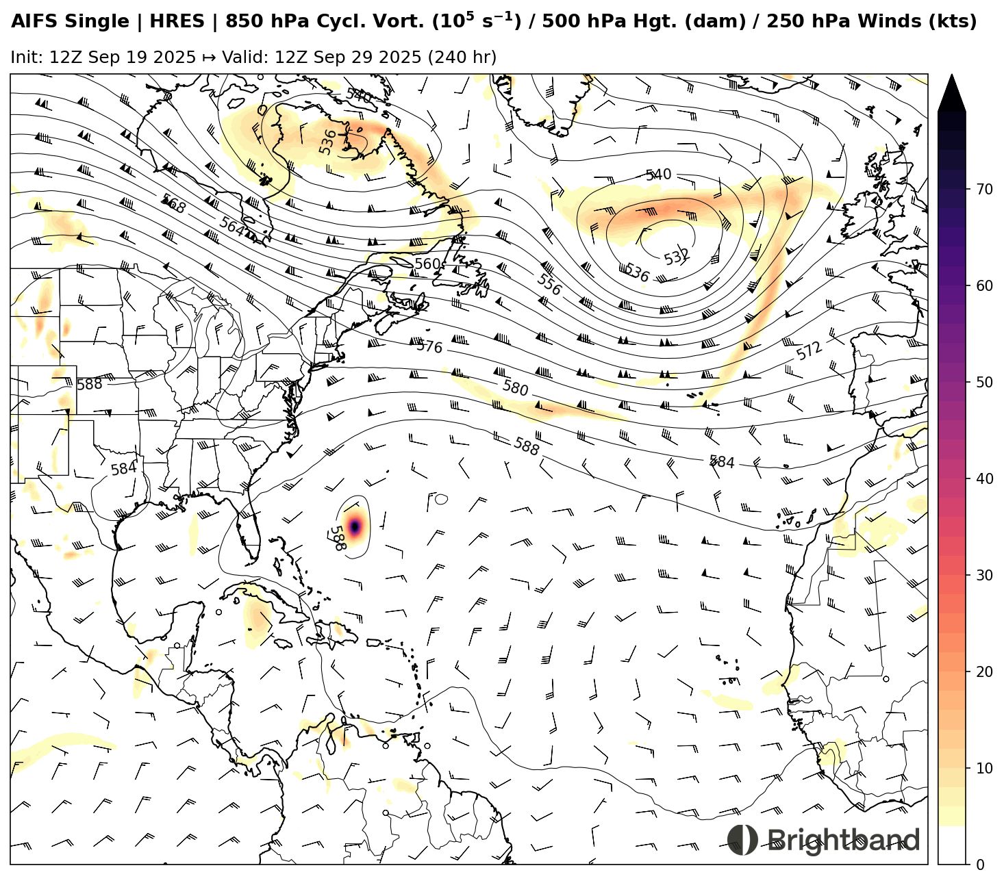 This discrepancy extends to the control forecasts as well. AIFS, for example, shows two storms developing in the NW Caribbean/SW Atlantic by Day 10 (Figure 3).