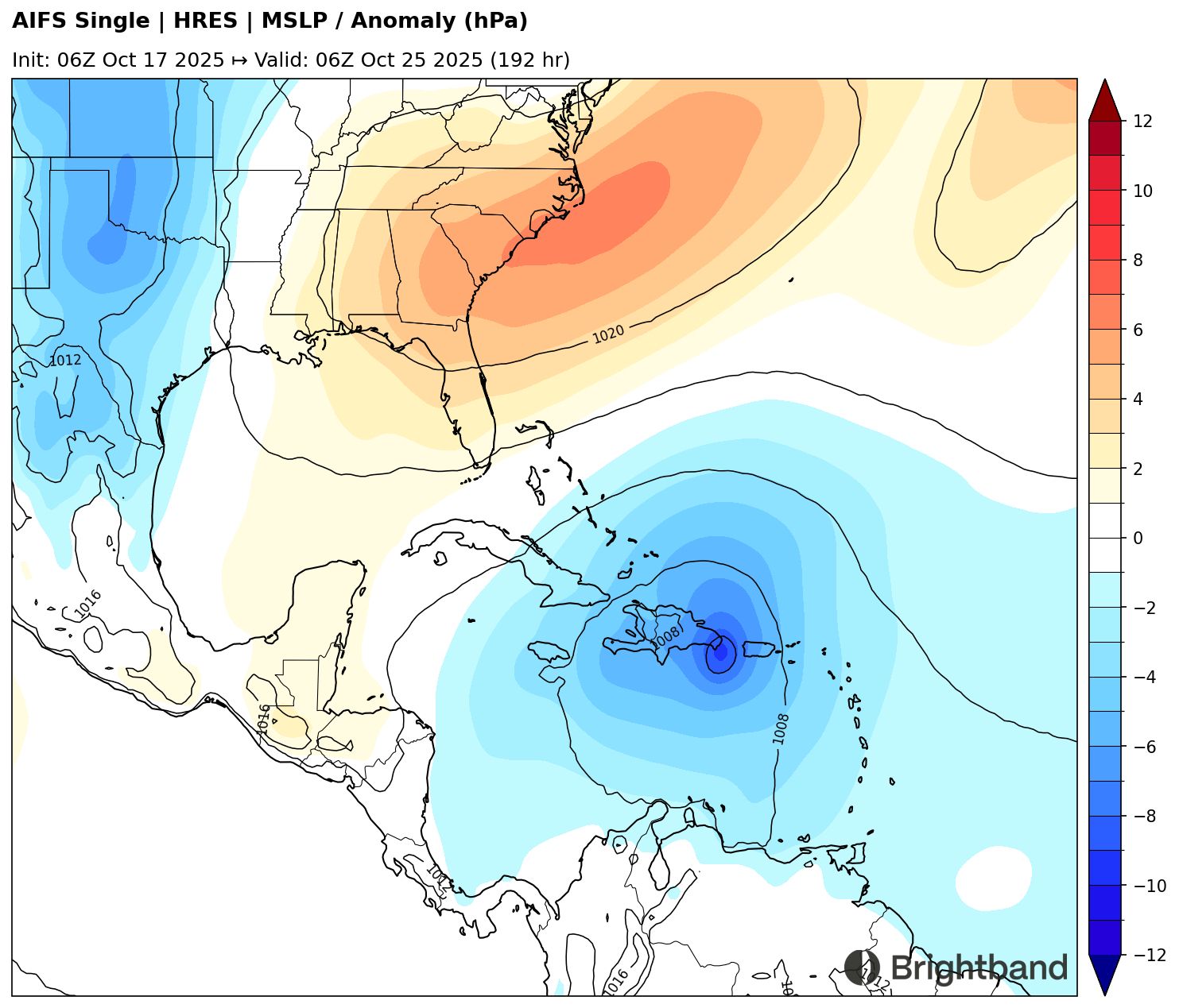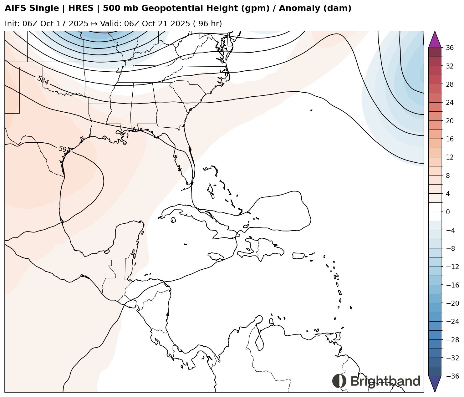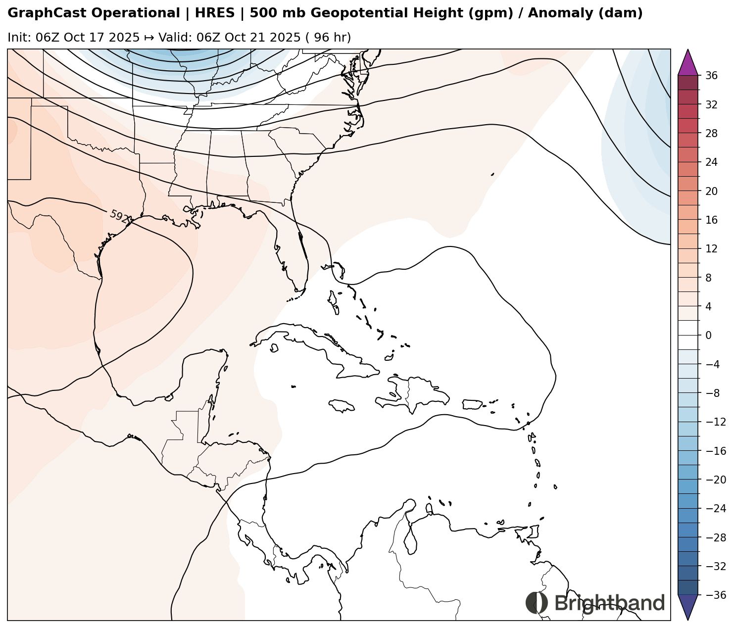 Part of the remaining uncertainty stems from synoptic differences. AIFS (Figure 6) has a stronger trough over the Central Atlantic in 4 days, with residual weakness north of the Antilles. In contrast, GraphCast shows the trough over the Central Atlantic lifting out more quickly, allowing the flank of the Mexican ridge to build north of the Caribbean and help trap the storm and prevent it from recurving immediately.