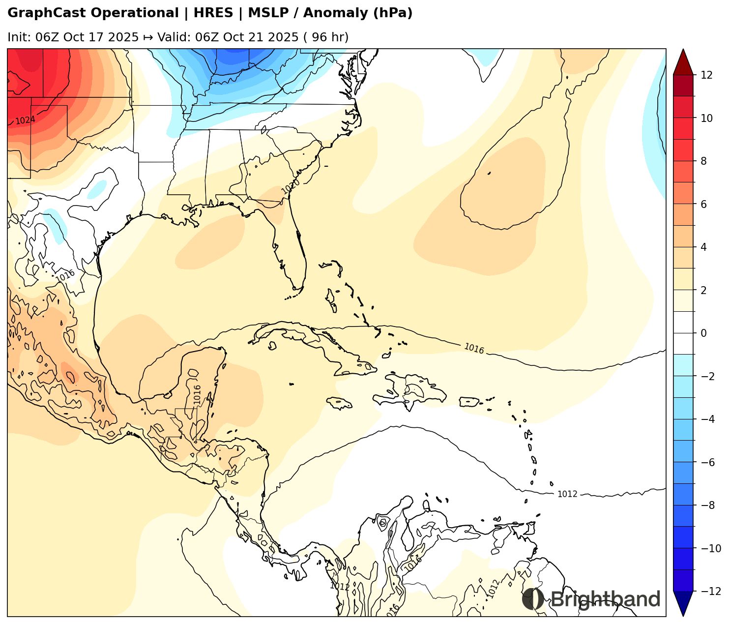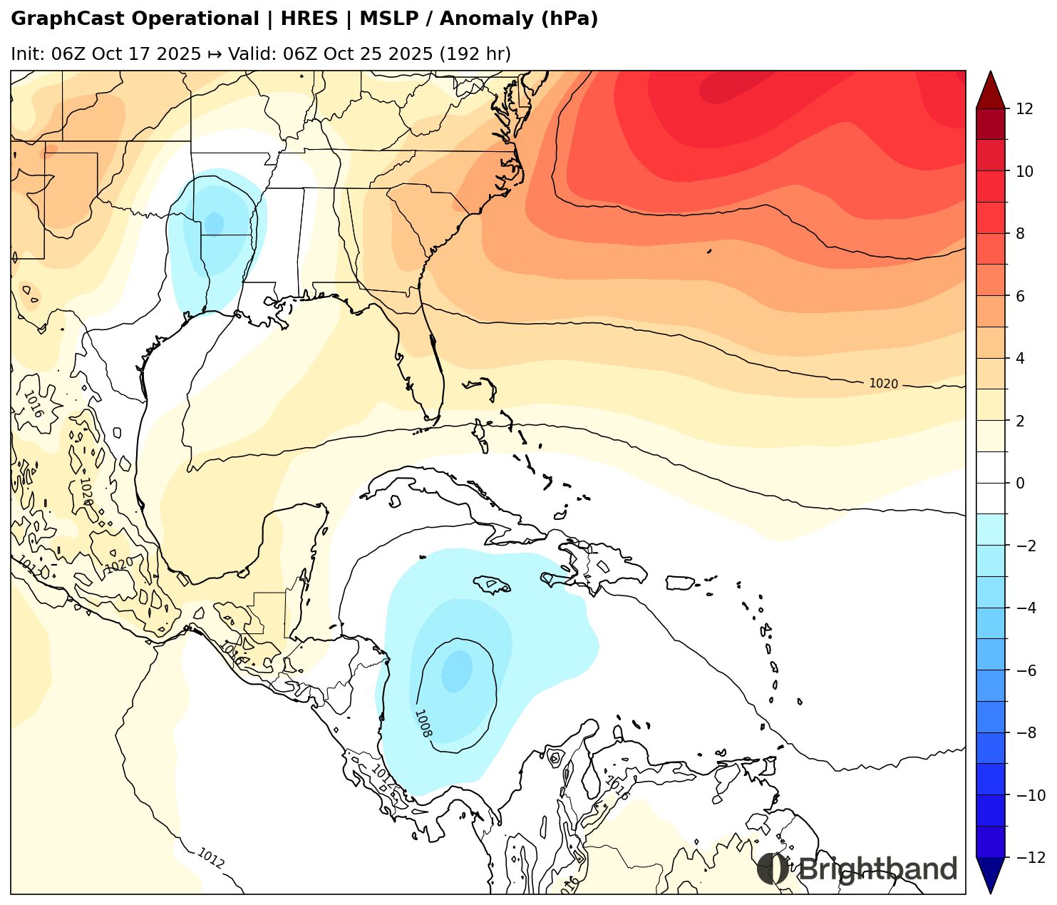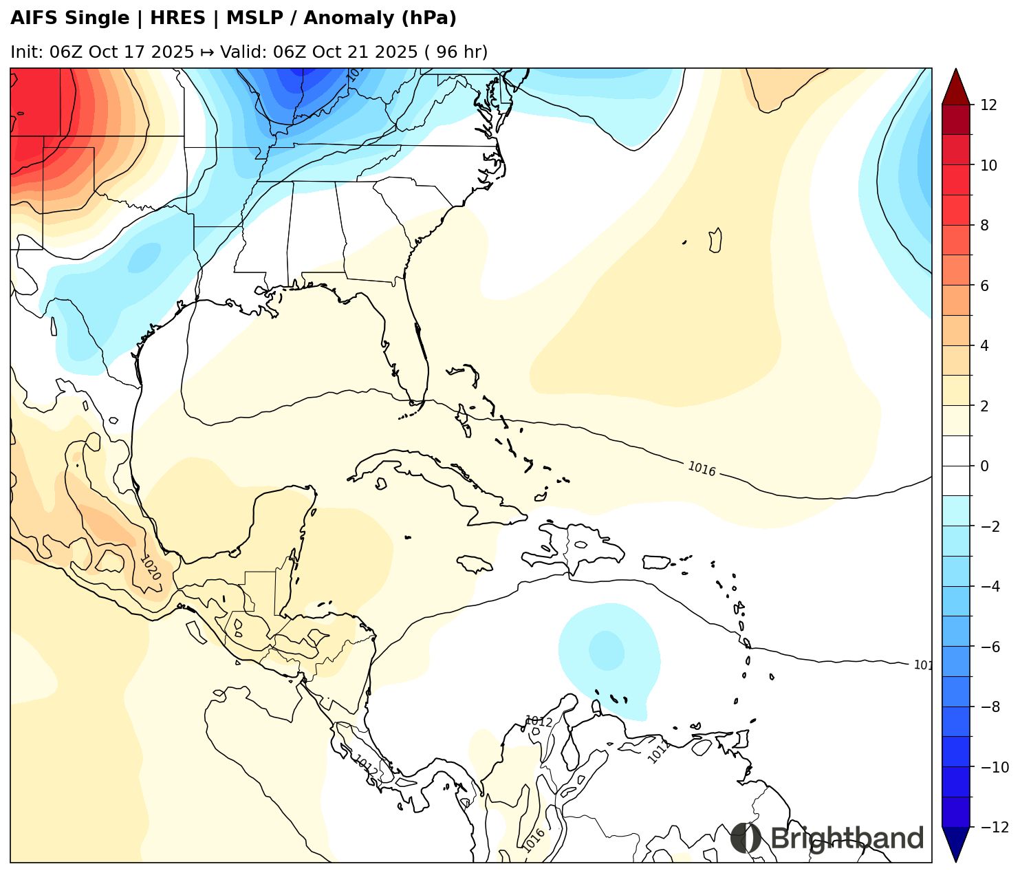 Part of the remaining uncertainty stems from synoptic differences. AIFS (Figure 6) has a stronger trough over the Central Atlantic in 4 days, with residual weakness north of the Antilles. In contrast, GraphCast shows the trough over the Central Atlantic lifting out more quickly, allowing the flank of the Mexican ridge to build north of the Caribbean and help trap the storm and prevent it from recurving immediately.